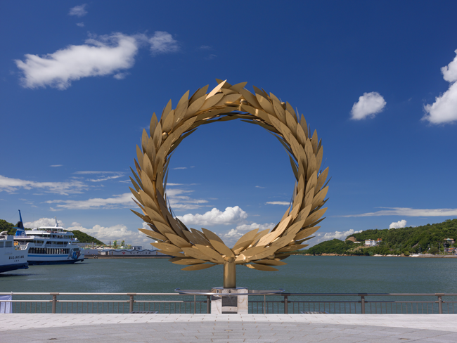 This sculpture is in the form of an olive wreath, right at the entranceway to Shodoshima, also known as the “Olive Island.” One can view the seascape through the gleaming golden ring.