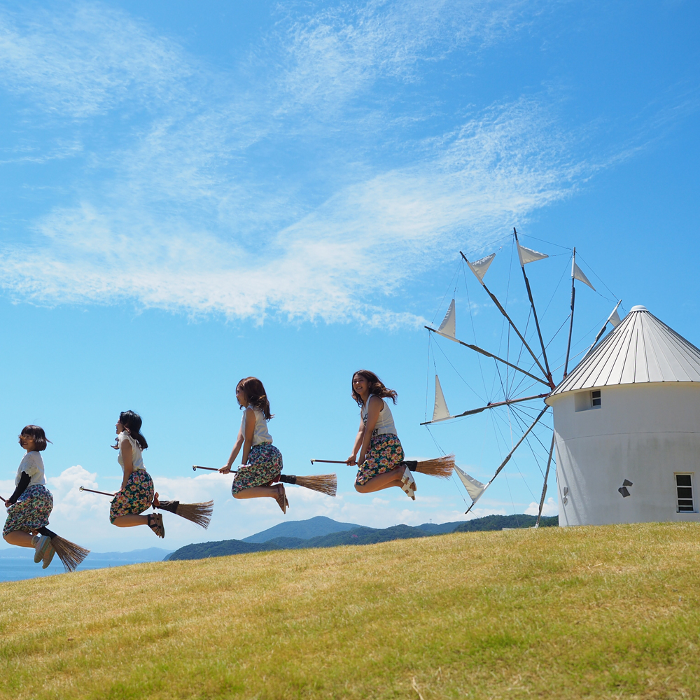 Enjoy Shodoshima’s sea breezes while riding a rental bicycle from Kusakabe Port to Olive Park. Why not try to find a heart-shaped leaf among the branches while admiring the oldest olive tree in Japan? Borrow a witch’s broom to get your photo taken posing as Kiki from the movie “Kiki’s Delivery Service” in front of the Greek windmill.