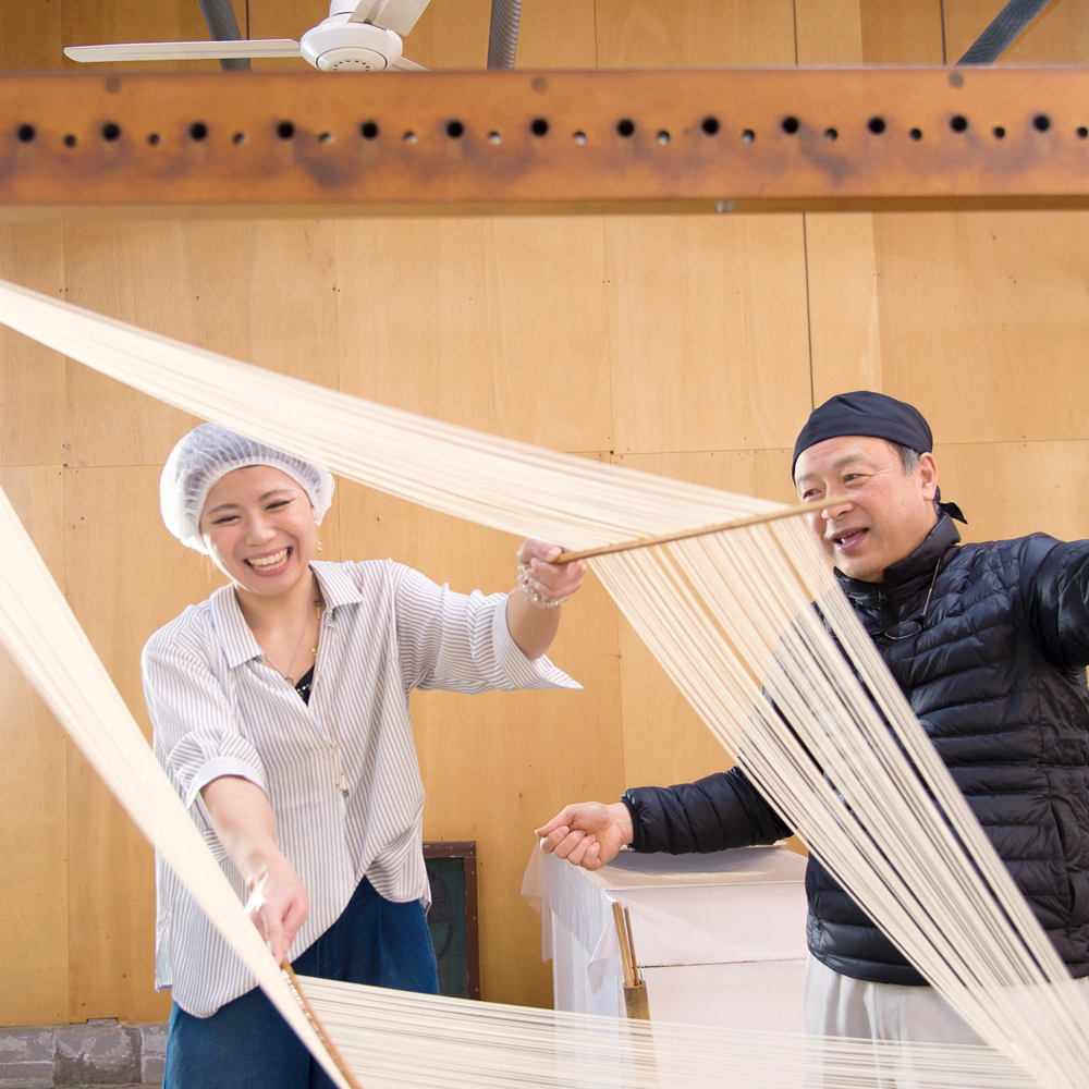 At Nakabu-An, which produces and sells somen noodles, listen to the explanation by a noodle maker, and use long chopsticks to divide somen noodles. You can also get a taste of truly fresh, undried somen that can only be eaten at Nakabu-An.